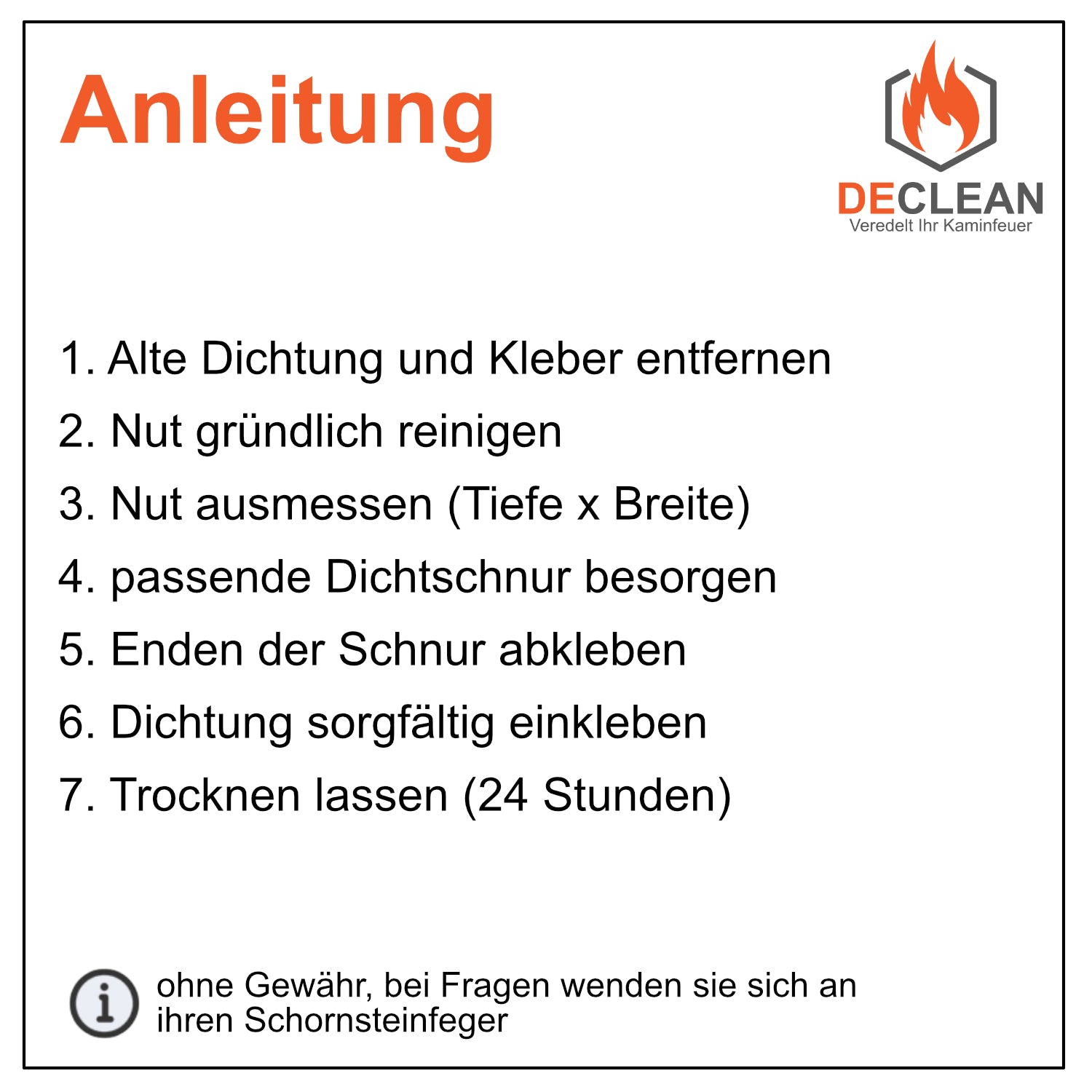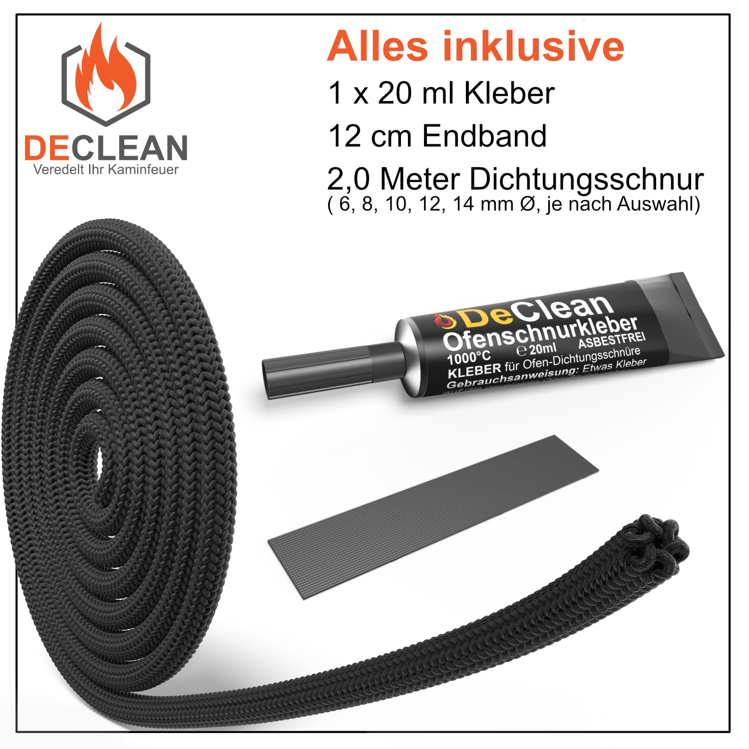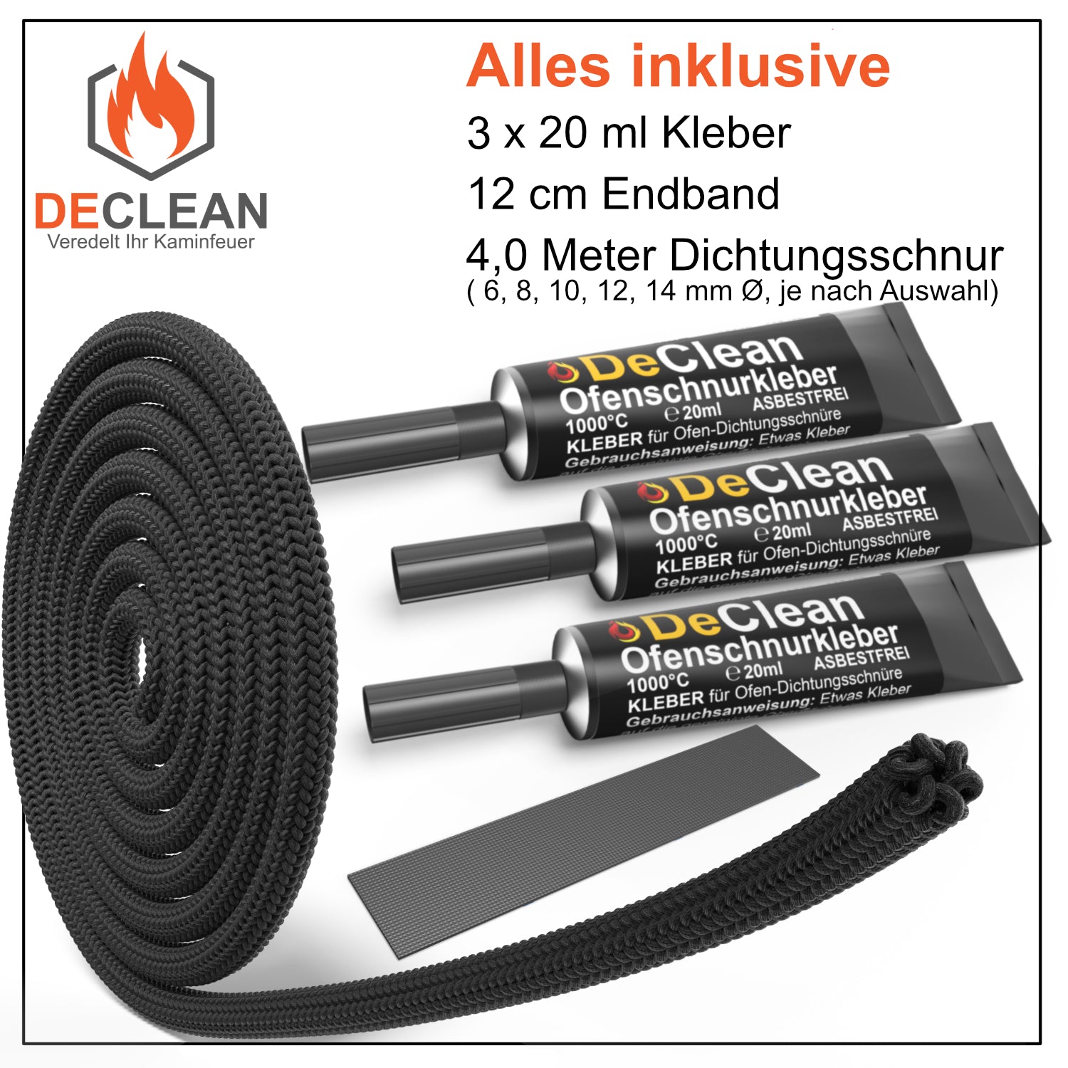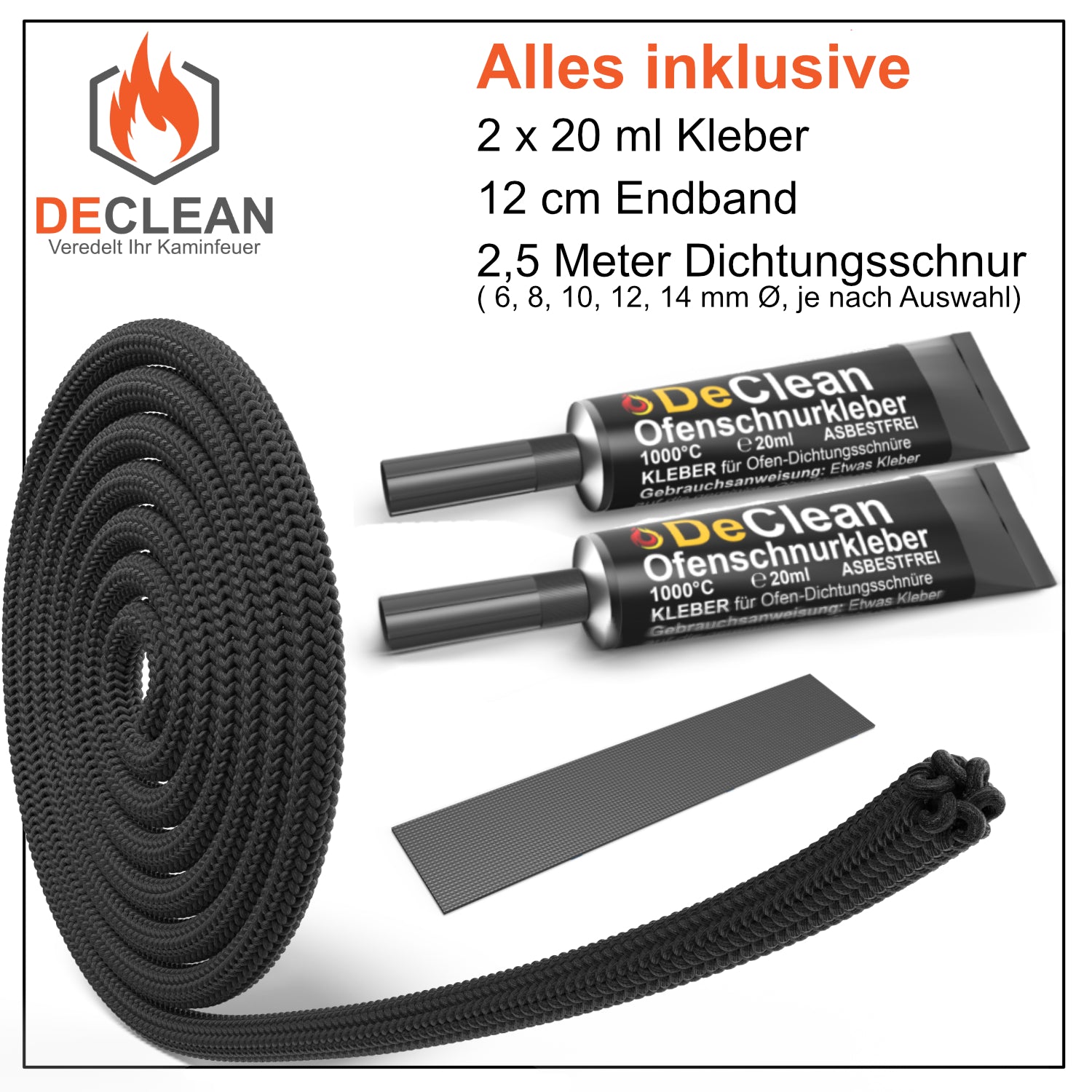 1x Set Glasfaser Türdichtung für Öfen  inkl. Dichtungsschnur, Kleber und  Endband (je nach Auswahl)